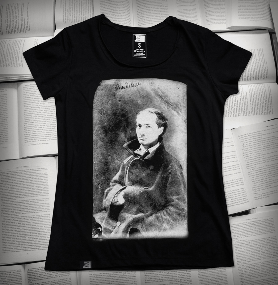 Na koszulce Baudelaire w wieku 34 lat (reprint zdjęcia z 1855 r. autorstwa Nadara).
