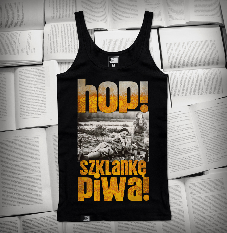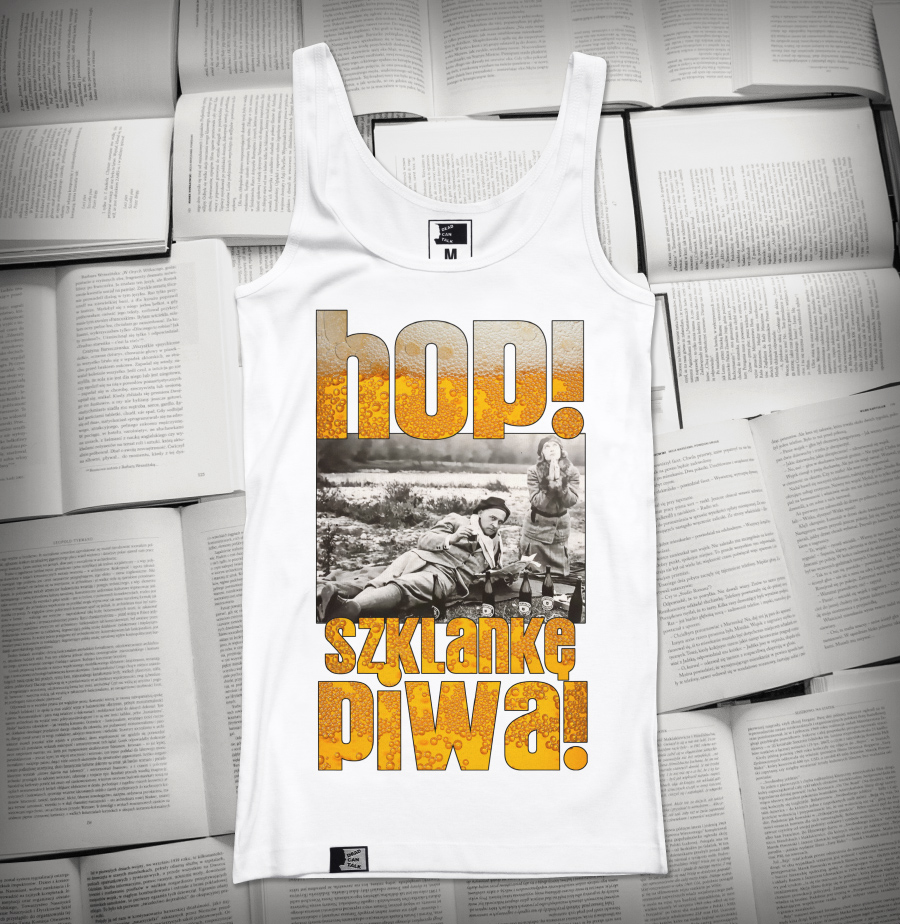 Tank-top damski w kolorze białym lub czarnym, 100% bawełny ringspun, gramatura 150. Nadruk wykonany metodą druku bezpośredniego (DTG).